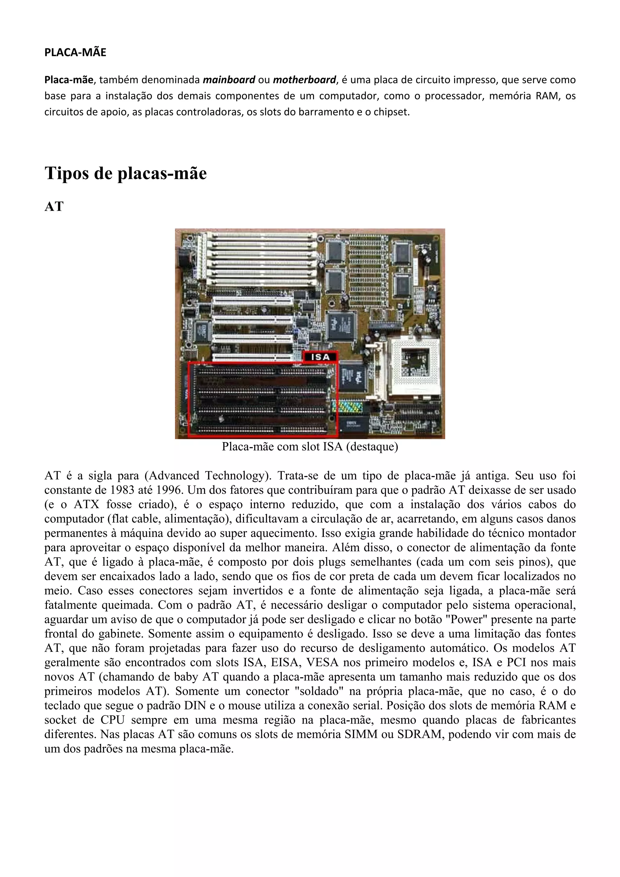 Placa-mãe é a base para instalação dos componentes de um computador, como processador, memória RAM e placas controladoras. Existem diferentes padrões de placas-mãe ao longo do tempo, como AT, ATX e ITX, cada um com características e conectores específicos. A placa-mãe interconecta todos os componentes através de slots e conectores.