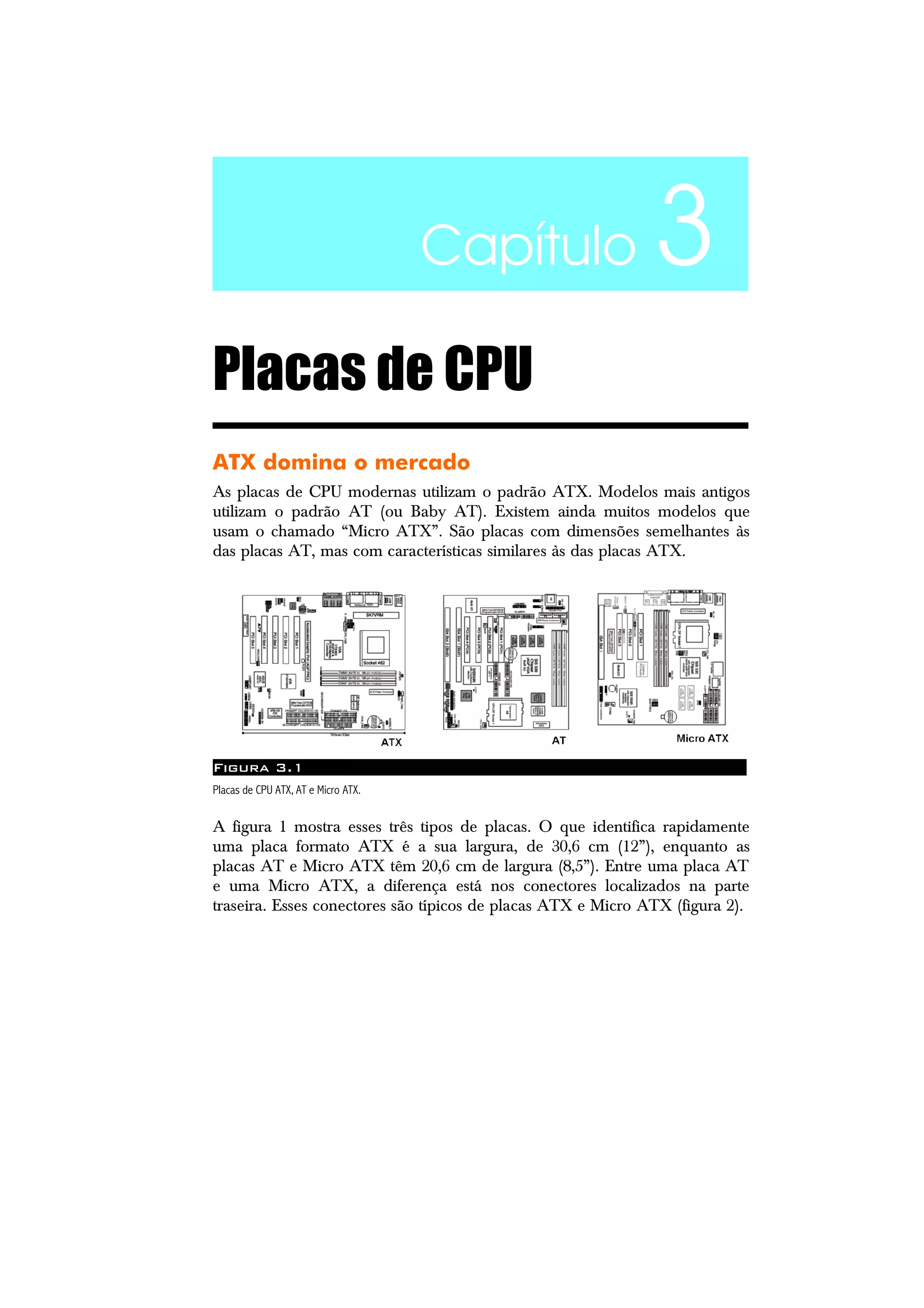 O documento descreve os principais tipos de placas de CPU, sendo o padrão ATX o mais comum atualmente. Detalha as diferenças entre os formatos ATX, AT e Micro ATX e discute a compatibilidade entre placas e processadores. Também apresenta os componentes típicos encontrados em placas de CPU modernas como slots, interfaces, chipset e BIOS.