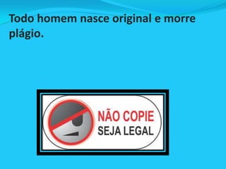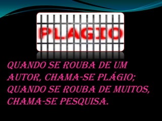 Plágio é considerado roubo quando se copia de um autor, mas é chamado de pesquisa quando se copia de muitos. Originalidade é algo que todos nascem com mas acabam se tornando plágios ao longo da vida. O documento reflete sobre como vivemos repetindo ideias e sonhos dos outros.