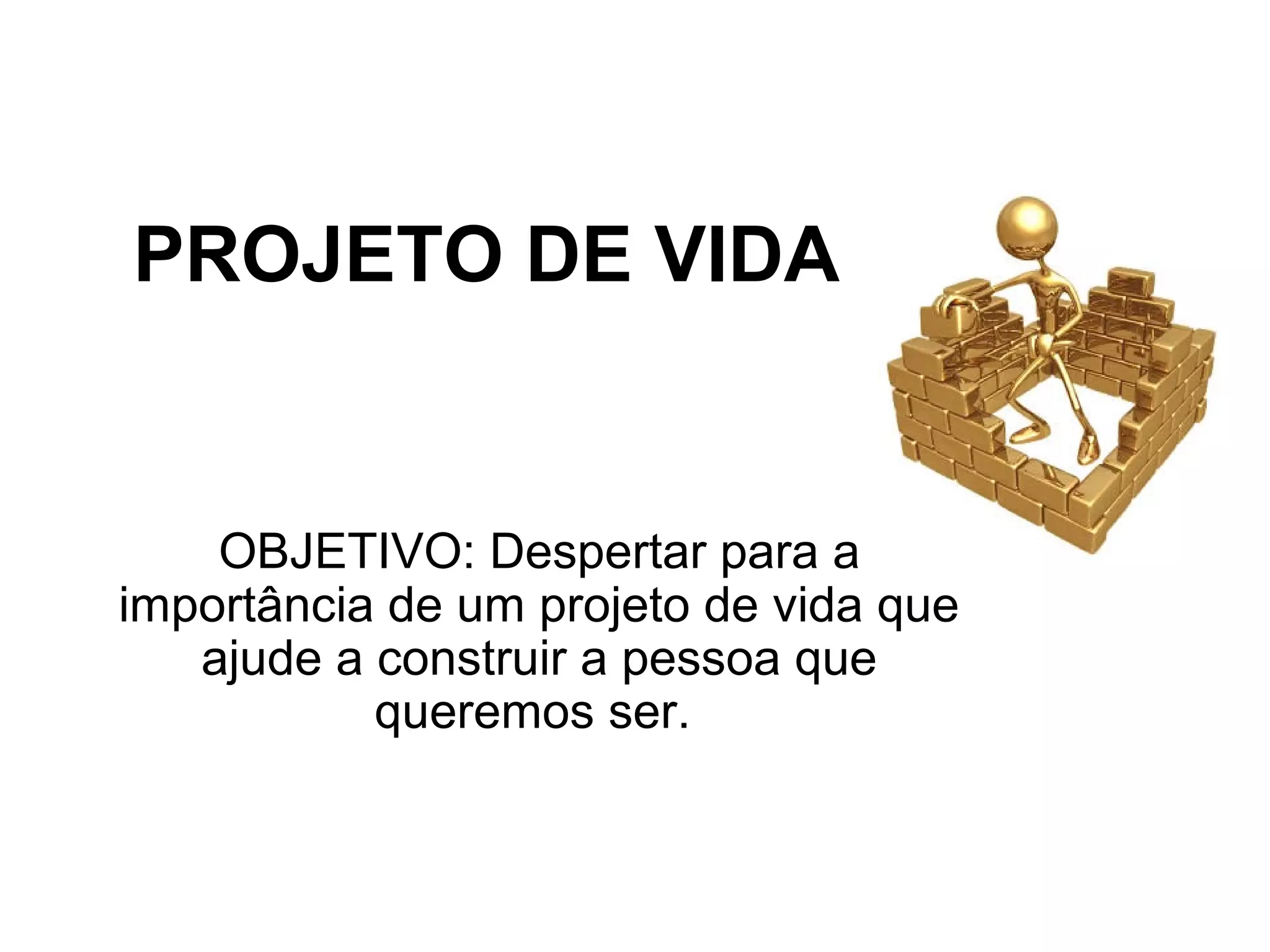 O documento discute a importância de se ter um projeto de vida bem definido. Ele fornece dicas para elaborar um projeto de vida, começando com autoconhecimento e definição de valores e pontos fortes, e depois elaborando uma missão pessoal e planos de ação detalhados com metas, estratégias e possibilidade de adaptação a mudanças. O objetivo final é ter uma vida feliz e de qualidade.