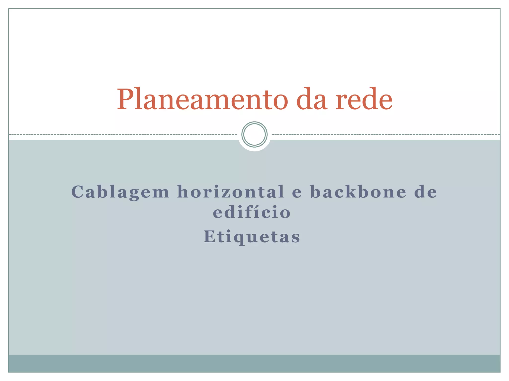 O documento descreve os principais aspectos a considerar no planeamento de uma rede, incluindo a cablagem horizontal de cada piso, a organização no armário de distribuição e a cablagem de backbone para interligar os pisos e edifícios.