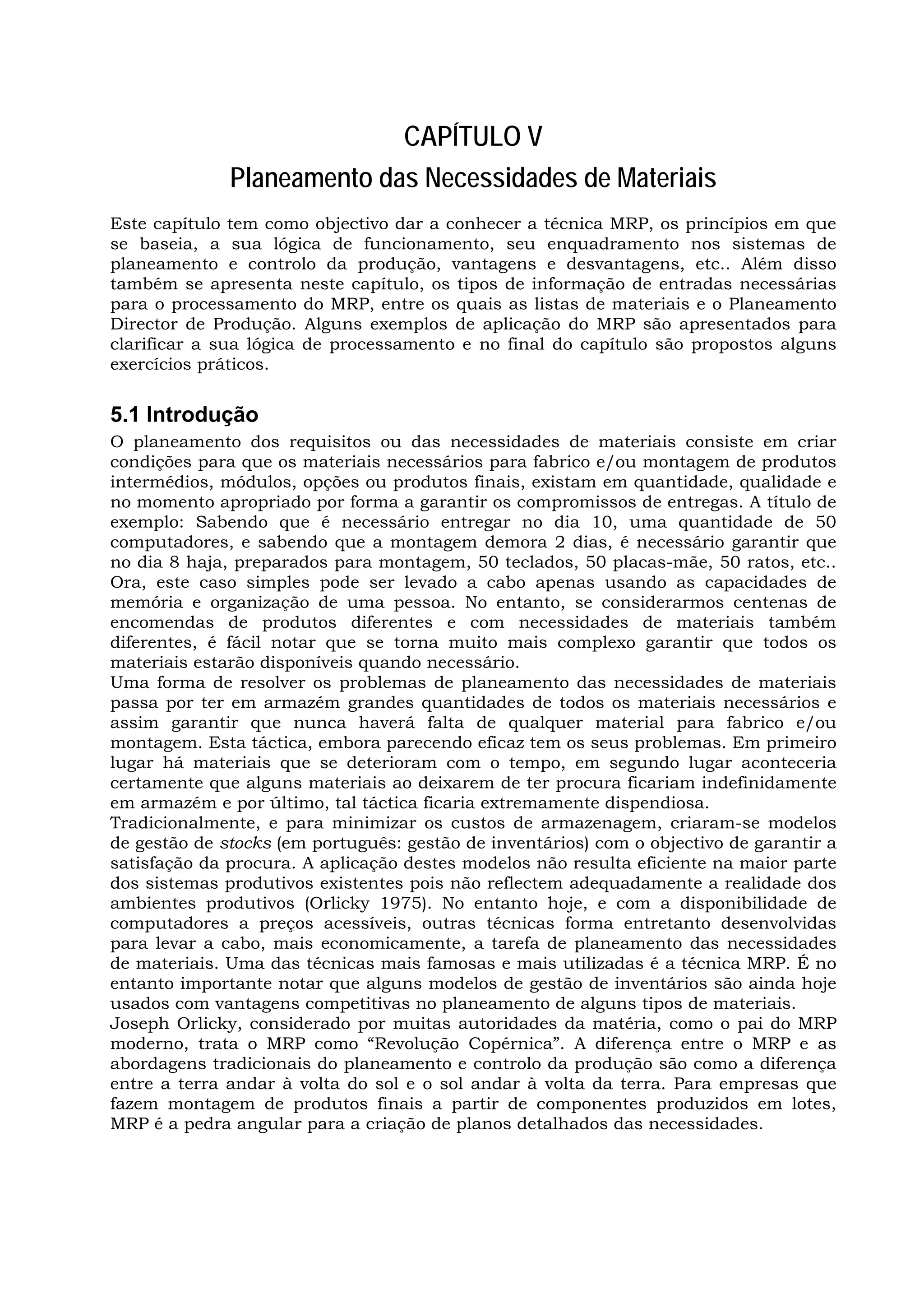 1) O capítulo descreve a técnica MRP, incluindo seus princípios, lógica de funcionamento e vantagens.