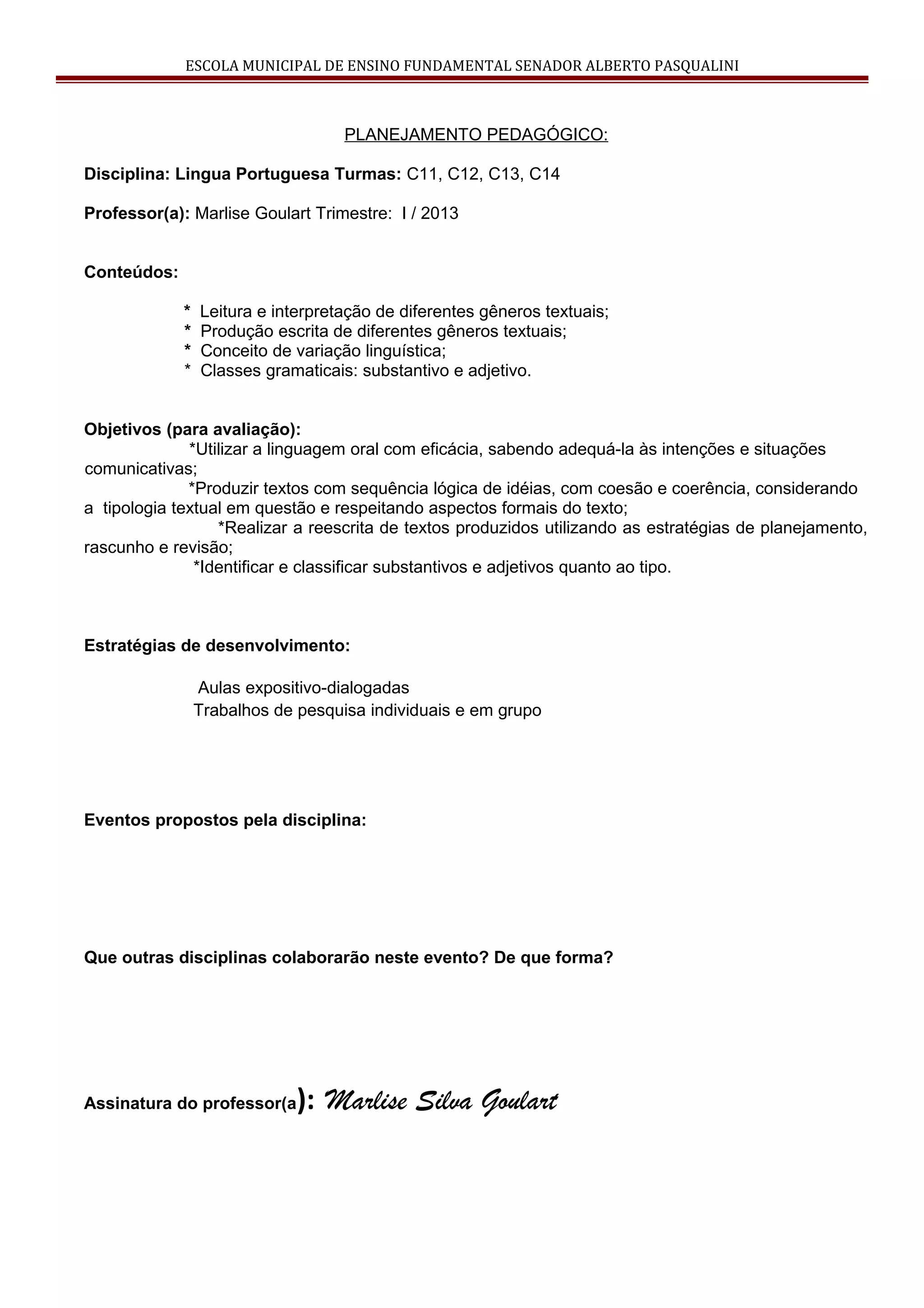 O documento apresenta o planejamento pedagógico trimestral de Língua Portuguesa para as turmas C11, C12, C13 e C14. Os conteúdos abordados serão leitura, produção textual, variação linguística e classes gramaticais. Os objetivos são o desenvolvimento da linguagem oral, produção textual considerando a tipologia e aspectos formais, reescrita de textos e identificação de substantivos e adjetivos. As estratégias incluem aulas expositivo-dialogadas e trabalhos de pesquisa individua