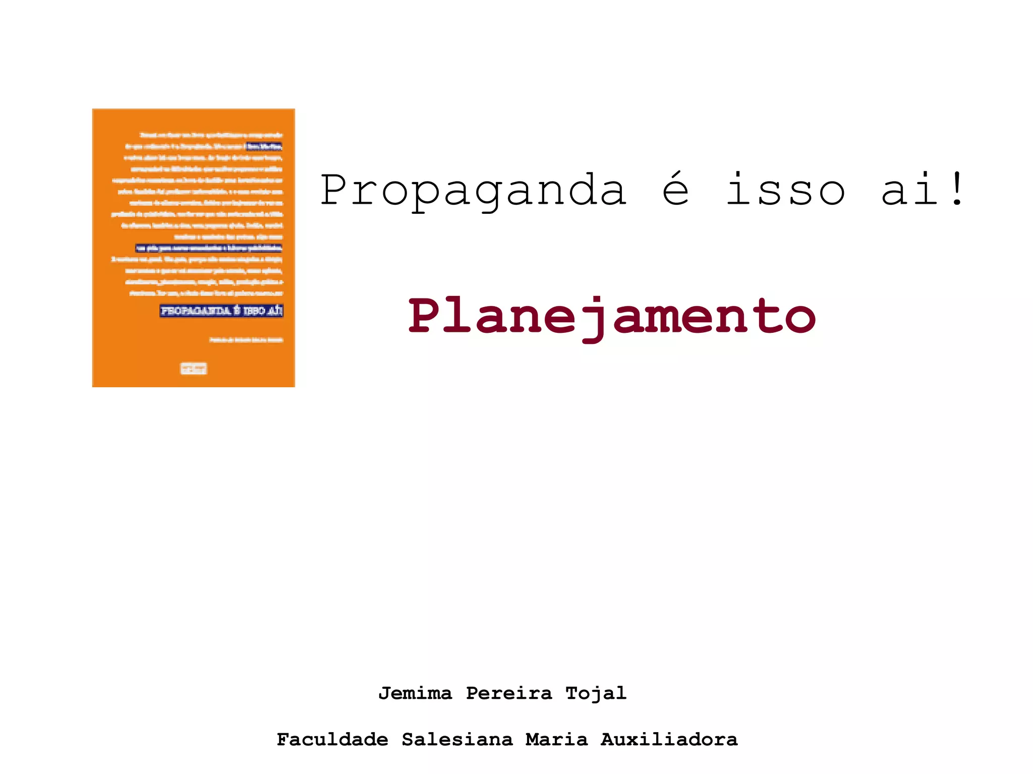 O documento discute os principais pontos do planejamento em propaganda, incluindo perguntas básicas sobre o público-alvo, análise de concorrência, determinação de orçamento e avaliação de resultados. Ele enfatiza a importância de entender profundamente as necessidades do cliente e como a estratégia de comunicação será implementada ao longo do tempo por meio de diferentes canais e atividades.