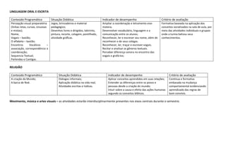 O documento apresenta o planejamento semestral para as unidades I, II, III e IV de uma turma de educação infantil. Os conteúdos programáticos estão organizados em eixos como Linguagem Matemática, Natureza e Sociedade, Linguagem Oral e Escrita e Religião. Cada conteúdo descreve as situações didáticas, indicadores de desempenho e critérios de avaliação. O objetivo geral é desenvolver de forma integral as crianças até 6 anos de idade nos aspectos físico, psicológico, inte