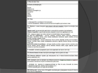 O documento discute os conceitos de planejamento, plano e tipos de planos de ensino como plano de curso, plano de unidade e plano de aula. Ele explica que o planejamento é um processo constante de aliar objetivos ao método de ensino e que um plano é um conjunto de medidas para realizar um evento. Além disso, apresenta as estruturas e propósitos dos diferentes tipos de planos.