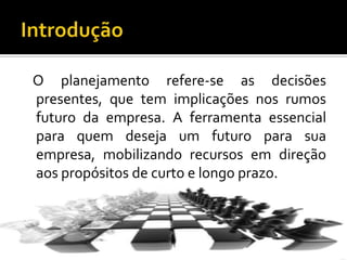 Introdução Oplanejamento refere-se as decisões presentes, que tem implicações nos rumos futuro da empresa. A ferramenta essencial para quem deseja um futuro para sua empresa, mobilizando recursos em direção aos propósitos de curto e longo prazo.