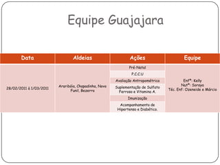 O documento apresenta o planejamento do Ministério da Saúde para atendimento de equipes de saúde indígena no Distrito Sanitário Especial Indígena de Amarante do Maranhão, listando as equipes Guajajara, Gavião e Guajajara e Gavião, e a composição da equipe do pólo base com o chefe, enfermeiros, odontólogo e nutricionista.