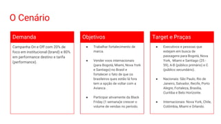 Este documento resume o planejamento digital da Avianca para o período de agosto a novembro de 2018, com foco em branding e performance. Os objetivos são fortalecer a marca Avianca, vender voos internacionais e participar ativamente da Black Friday, aumentando as vendas. A estratégia envolve anúncios online, redes sociais e mídia programática para alcançar executivos que buscam passagens para Bogotá, Nova York, Miami e Santiago.