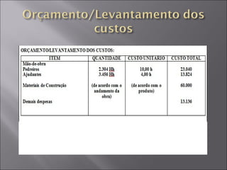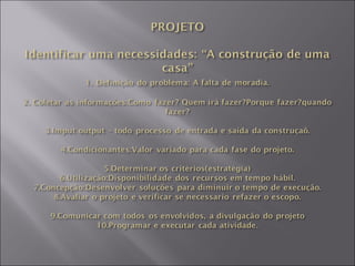 Este documento descreve um projeto de construção de uma casa com 9 cômodos, 3 quartos, garagem e custo estimado de R$ 110.000,00. O projeto terá início em 01/06/2011 e término em 01/01/2012 e trará benefícios de moradia própria para o cliente, lucros para a empresa e experiência para a equipe.