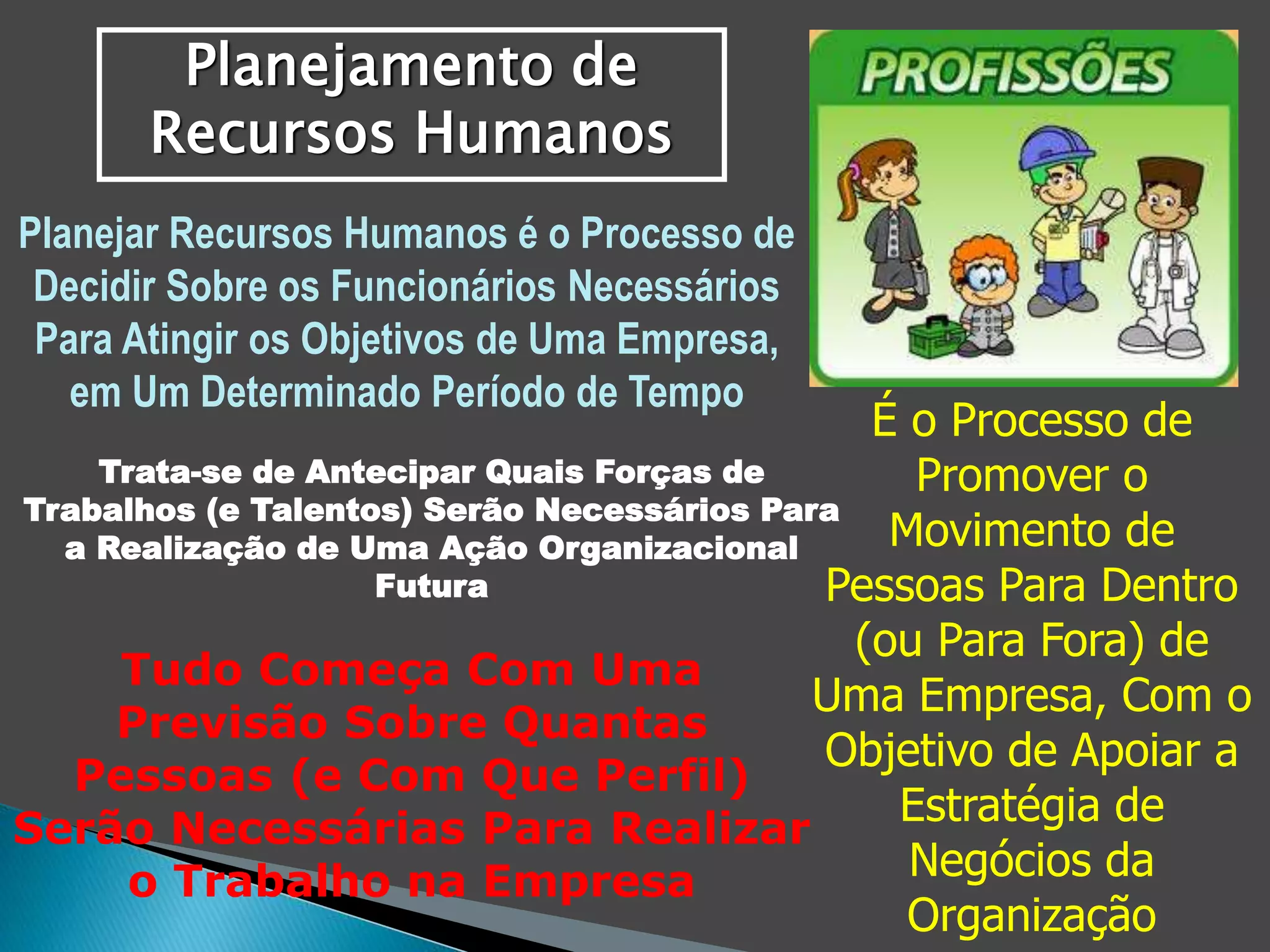 O documento discute o planejamento de recursos humanos, que envolve decidir sobre os funcionários necessários para atingir os objetivos da empresa em um determinado período, antecipando as forças de trabalho e talentos necessários no futuro. Também aborda planejar necessidades, rotatividade, treinamento, recrutamento, seleção e demissões.