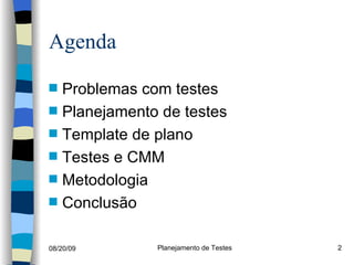 O documento discute problemas comuns com testes de software e propõe uma metodologia para planejamento de testes. Apresenta problemas como falta de importância aos testes, recursos insuficientes e ausência de padronização. Propõe tratar os testes como um subprojeto com planejamento, métricas e integração ao desenvolvimento. A metodologia inclui análise de riscos, objetivos de teste, casos de teste, execução de diferentes tipos de teste e relatórios.