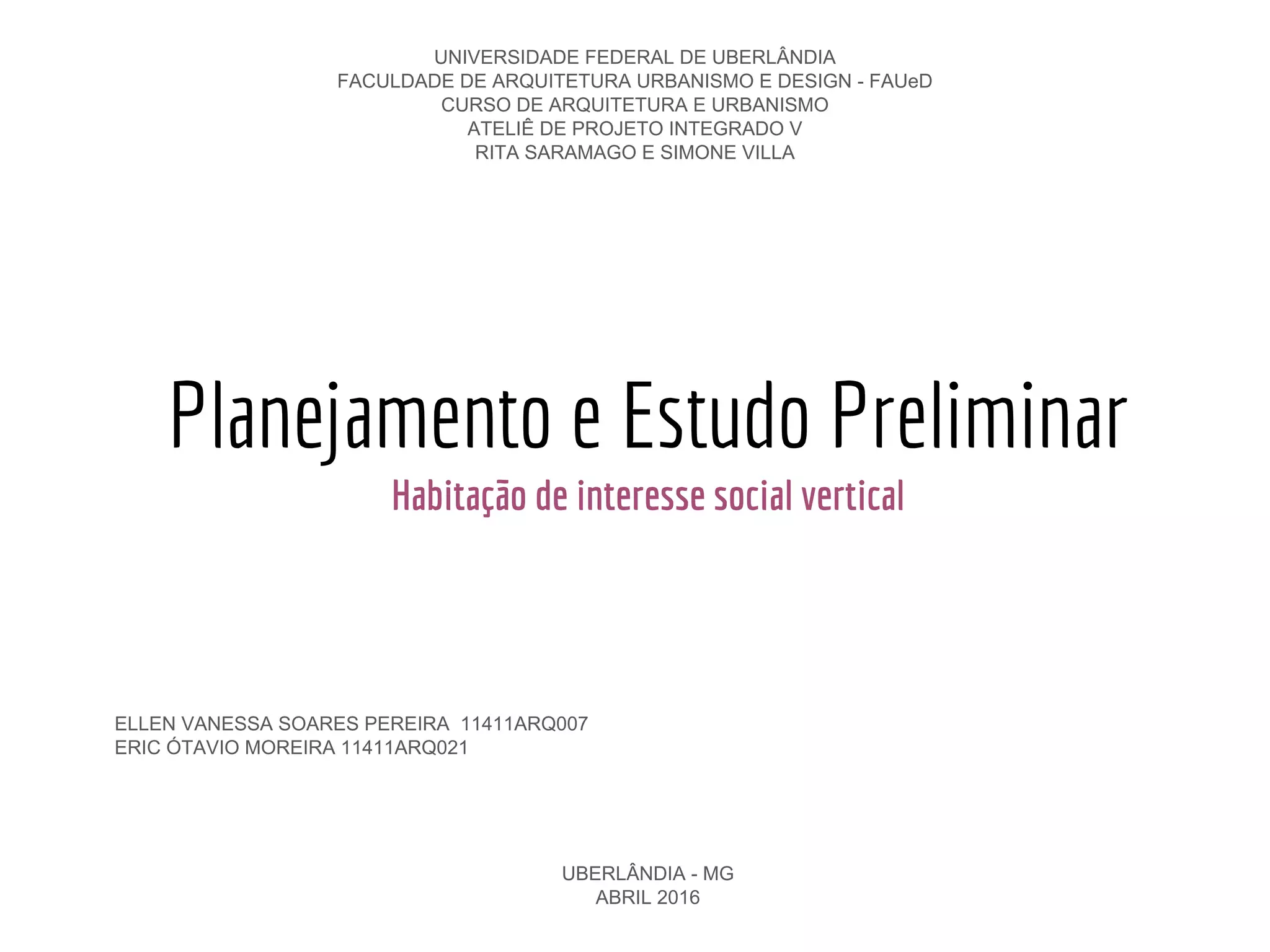 O documento apresenta um estudo preliminar para um projeto de habitação social vertical em Uberlândia. Descreve a localização do terreno, condicionantes físicas, legais e urbanísticas, além de estudos preliminares de acessibilidade, insolação, ventilação e custos estimados.