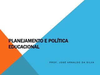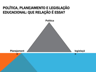 Este documento discute as relações entre política, planejamento e legislação educacional no Brasil. Aborda os seguintes pontos: