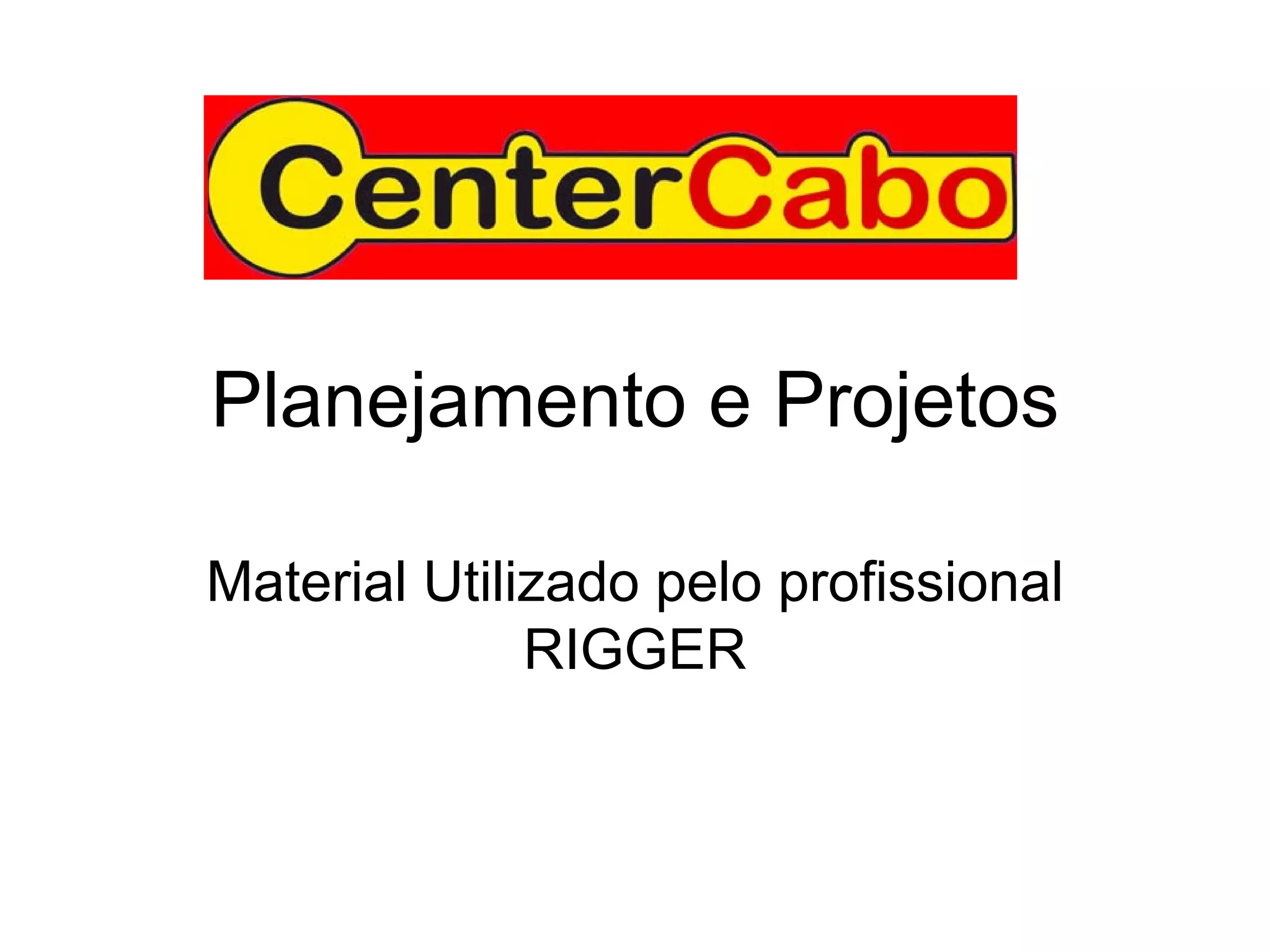 O documento descreve o material utilizado pelo profissional Rigger, que é responsável pelo planejamento e projetos de montagem e desmontagem de estruturas e equipamentos em eventos.