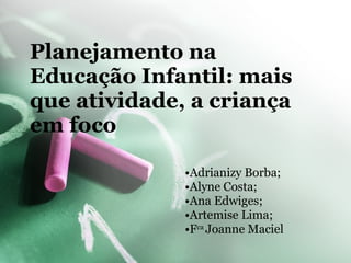 Este documento discute diferentes abordagens para o planejamento na educação infantil, incluindo planejamento baseado em atividades, datas comemorativas, desenvolvimento da criança e temas. Também destaca a importância da observação das crianças, da linguagem e da escuta por parte dos educadores para um planejamento eficaz e centrado na criança.