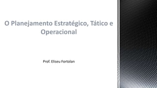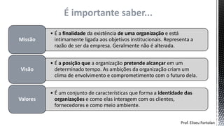 O documento discute os conceitos de missão, visão e valores de uma organização, e fornece exemplos de cada um. Também aborda os conceitos de planejamento estratégico, tático e operacional, analisando suas definições e sequência lógica. Por fim, explica as estratégias competitivas de custo, diferenciação e foco.
