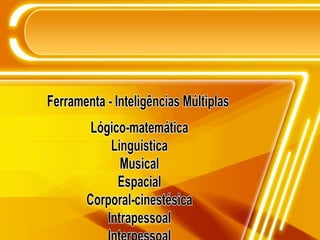 O documento lista e descreve vários tipos de inteligência humana, incluindo lógico-matemática, linguística, musical, espacial, cinestésica, intrapessoal e interpessoal. Ele fornece detalhes sobre as habilidades associadas a cada tipo de inteligência e sua importância para o indivíduo e a sociedade.