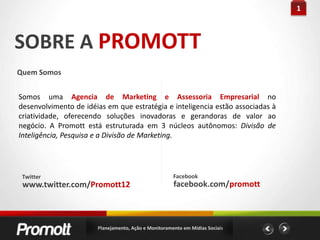 O documento discute estratégias de planejamento, ação e monitoramento em mídias sociais para empresas. Ele enfatiza a importância de ouvir o público-alvo, definir objetivos e métricas claras, e selecionar as redes sociais e canais mais relevantes antes de tomar qualquer ação. Também fornece dicas sobre como criar conteúdo valioso, interagir com usuários, gerenciar crises e orientar colaboradores nas mídias sociais.