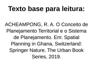 O documento discute conceitos e abordagens de planejamento territorial, apresentando: 1) Os objetivos e escalas de atuação do planejamento territorial, como definir onde investir recursos de forma a reduzir desigualdades; 2) Os diferentes métodos e ferramentas de planejamento, como zoneamento ambiental e planos diretores; 3) A importância da participação social no processo de planejamento.