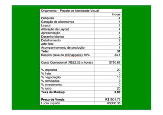O documento fornece dicas sobre planejamento financeiro e de tempo para projetos freelance, incluindo como transformar custos variáveis em fixos, estimar custos mensais de itens como eletricidade, e dividir orçamentos anuais de marketing em verbas mensais. Também ensina a dividir projetos em etapas e estimar horas para cada uma, além de considerar um tempo reserva para imprevistos.