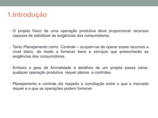 O documento discute planejamento e controle da produção. Aborda a diferença entre planejamento e controle, a importância de ambos, perspectivas de rede de suprimentos e gestão da capacidade produtiva a longo prazo.