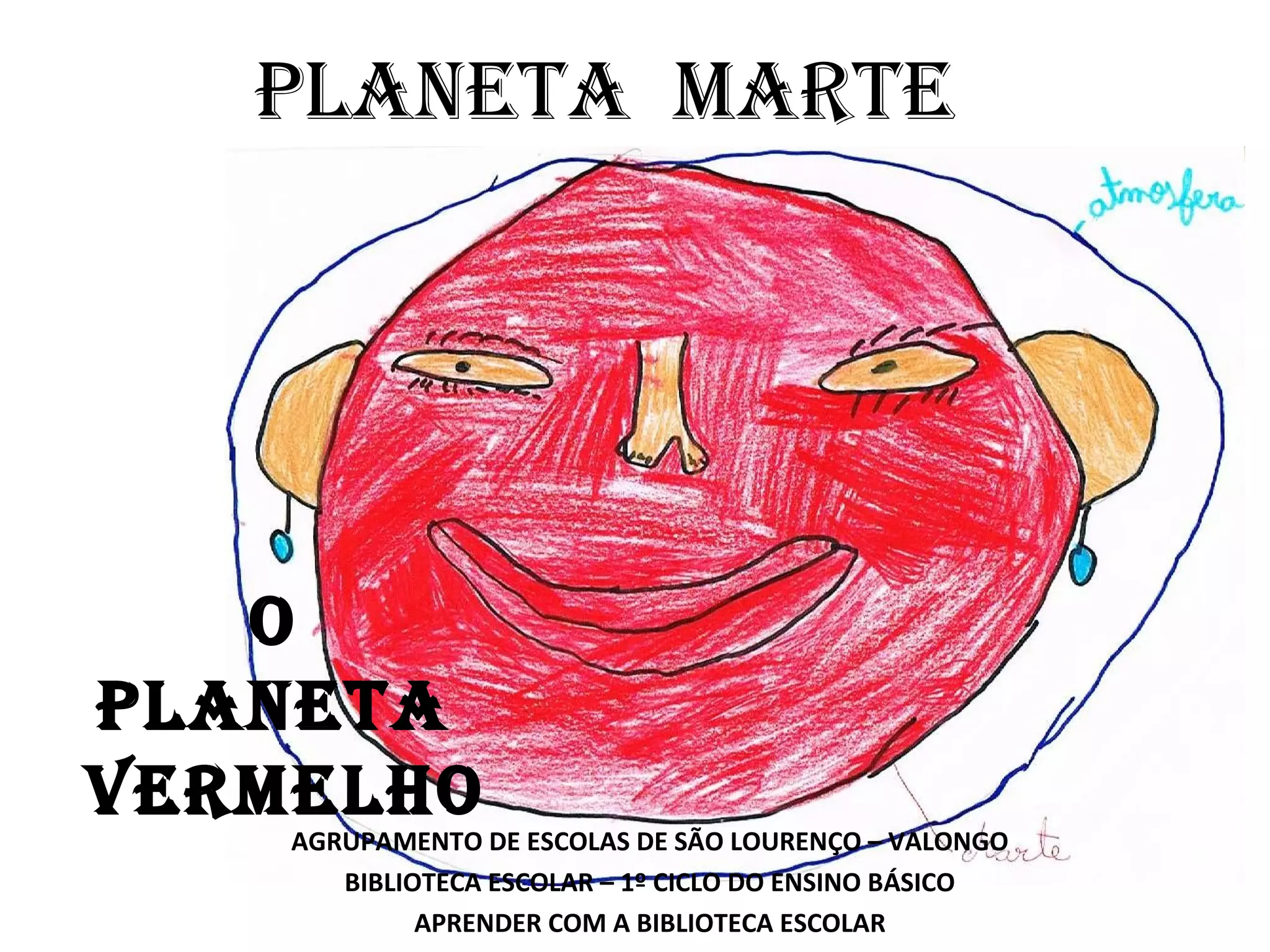 Marte é o quarto planeta do sistema solar. Tem uma atmosfera rarefeita e temperatura média de -59°C. É vermelho devido aos gases em sua atmosfera. Tem metade do tamanho da Terra e demora 687 dias para orbitar o Sol e 24 horas para girar em seu eixo. Possui duas luas chamadas Phobos e Deimos. Há possibilidade de ter existido vida antigamente, mas atualmente não há seres humanos no planeta.