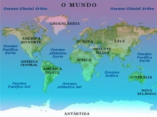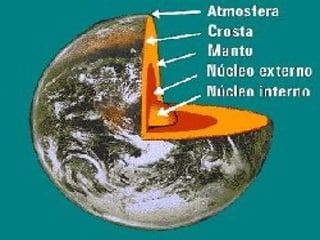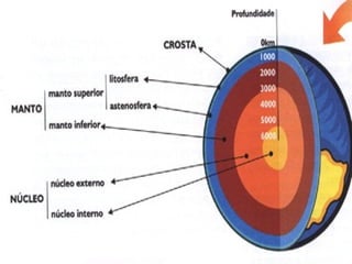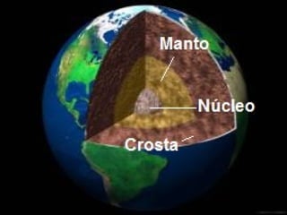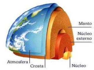 O documento descreve as três camadas que constituem o planeta Terra: a crosta, o manto e o núcleo. A crosta é a parte da superfície terrestre e pode atingir até 80 quilômetros de profundidade. O manto está abaixo da crosta. O núcleo é a camada no centro do planeta e mede aproximadamente 7.000 quilômetros de diâmetro.