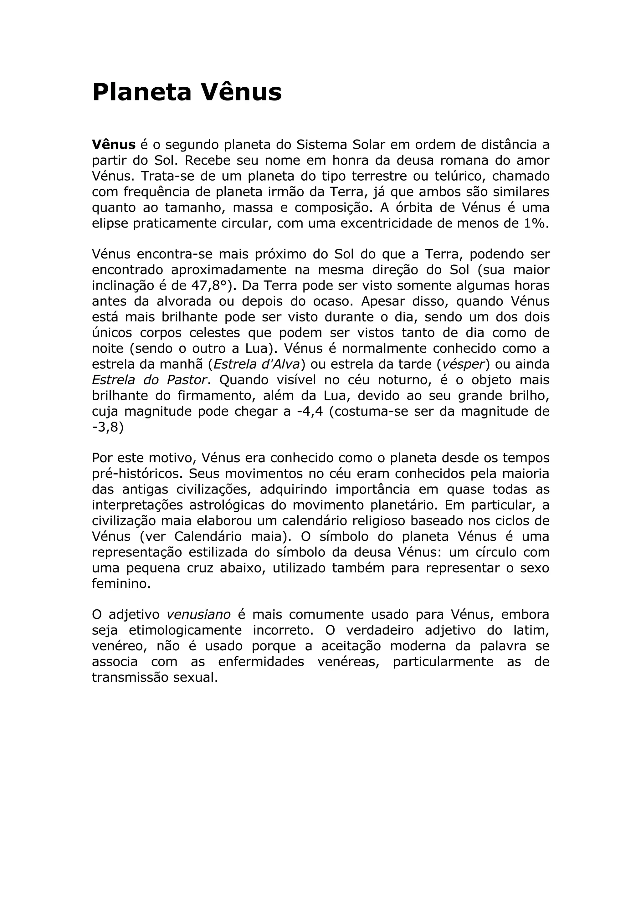 Vênus é o segundo planeta do Sistema Solar em distância ao Sol e recebe seu nome em homenagem à deusa romana do amor, Vênus. Sua órbita é quase circular e possui uma atmosfera densa composta principalmente por dióxido de carbono, que causa um forte efeito estufa e eleva a temperatura da superfície a níveis extremos, fazendo de Vênus o planeta mais quente do Sistema Solar.