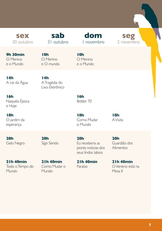 O documento apresenta a programação de exibições de filmes no Centro Integrado de Cultura (CIC) entre os dias 26 de outubro a 13 de novembro. A programação inclui títulos, horários e dias de exibição dos filmes durante as manhãs, tardes e noites no período.
