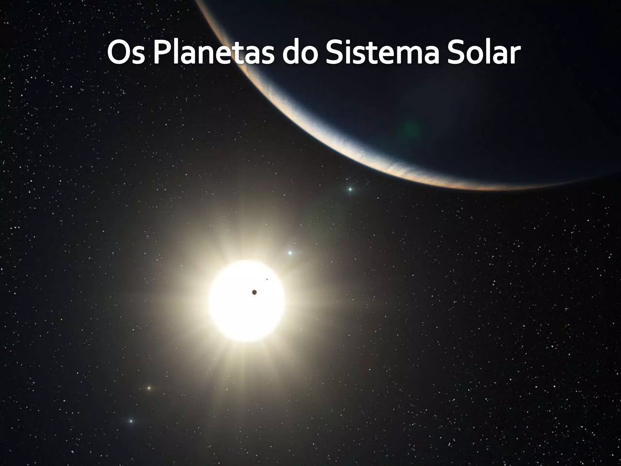 OS PLANETAS DOSISTEMA SOLARMercúrioé o planeta mais próximo do Sol, e tem uma órbita invulgarmente excêntrica (apenas Plutão tem uma excentricidade maior). É o planeta que orbita com maior velocidade (o ano mercuriano tem apenas 88 dias). e é o segundo mais quente (logo a seguir a Vénus).Vénusé o segundo planeta mais próximo do Sol e o planeta mais próximo da Terra. As perguntas intrigantes que este planeta "gémeo" da Terra nos coloca começam com o seu movimento de rotação própria. Uma rotação completa sobre si mesmo demora 243.01 dias, o que é um período invulgarmente longo.TERRAè o 3º planeta a contar do Sol, apesar de ser aquele que conhecemos melhor, continua a ser o que nos intriga mais. Única no nosso sistema solar, a complexidade física e química dos mecanismos que a fizeram um lugar tão propício à vida continua a surpreender-nos e a intrigar-nos. Terá sido a origem da vida na Terra um evento único num Universo estéril.