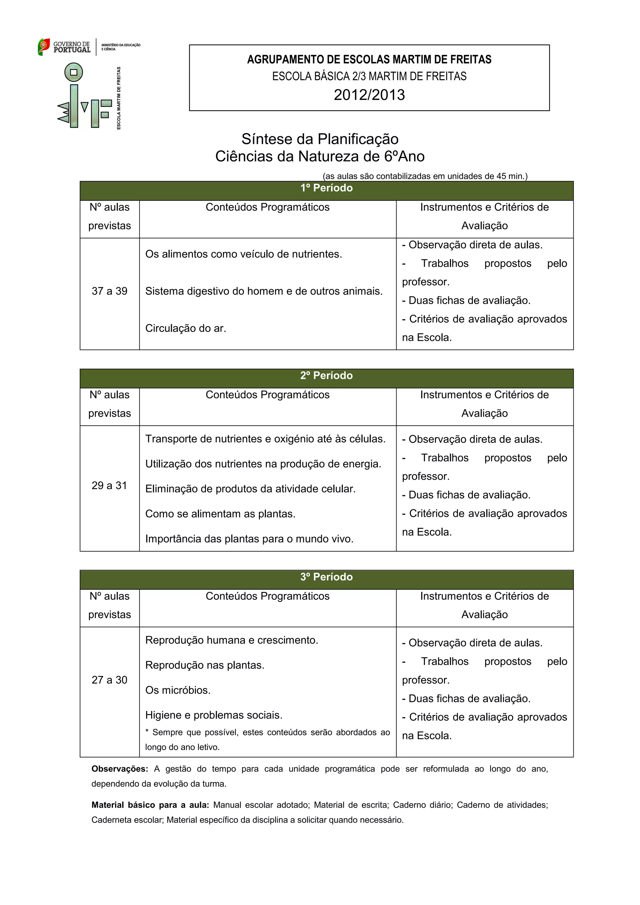 O documento apresenta o plano de aulas de Ciências da Natureza do 6o ano dividido em 3 períodos com diferentes conteúdos programáticos a serem abordados, como alimentação, circulação, reprodução e micróbios. Cada período terá entre 27 a 39 aulas avaliadas por observação, trabalhos e fichas segundo critérios da escola.