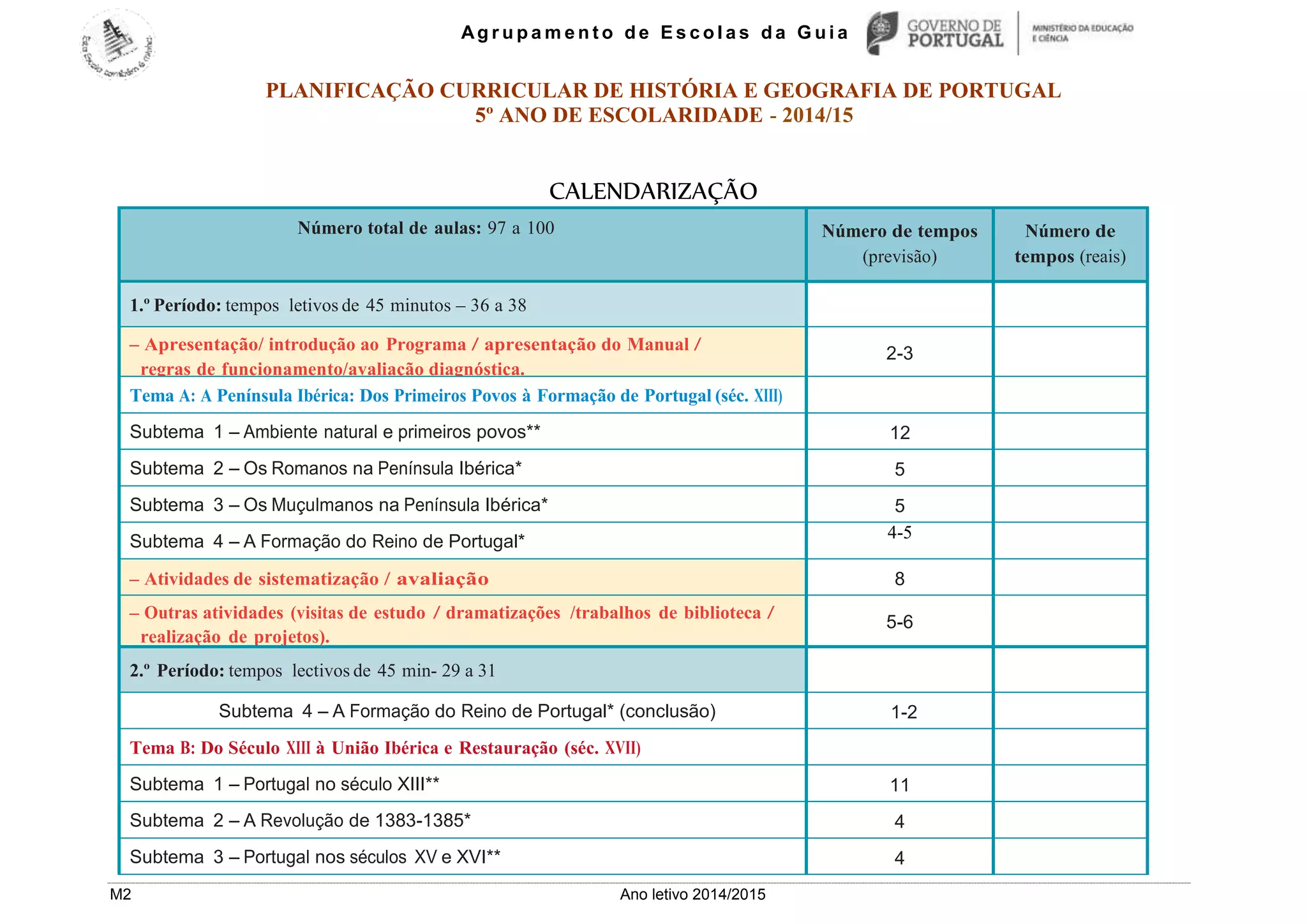 Este documento apresenta a planificação curricular de História e Geografia de Portugal para o 5o ano de escolaridade no ano letivo de 2014/2015. O plano inclui três períodos letivos com um total de 97 a 100 aulas divididas entre dois temas principais: A) A Península Ibérica: Dos Primeiros Povos à Formação de Portugal; e B) Do Século XIII à União Ibérica e Restauração. Cada tema é dividido em vários subtemas com conteúdos, conceitos, atividades de aprendizagem