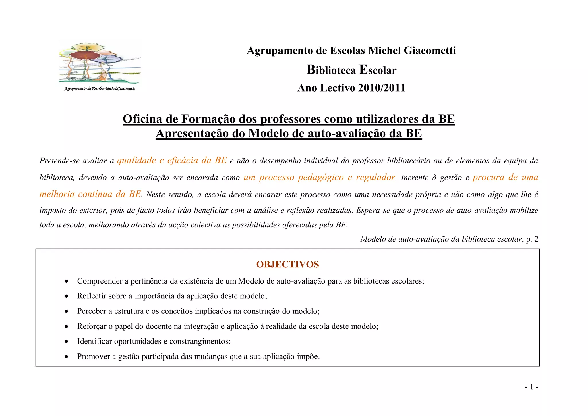 a) O documento apresenta um modelo de auto-avaliação para bibliotecas escolares com o objetivo de avaliar a qualidade e eficácia de forma contínua e melhorar o serviço.