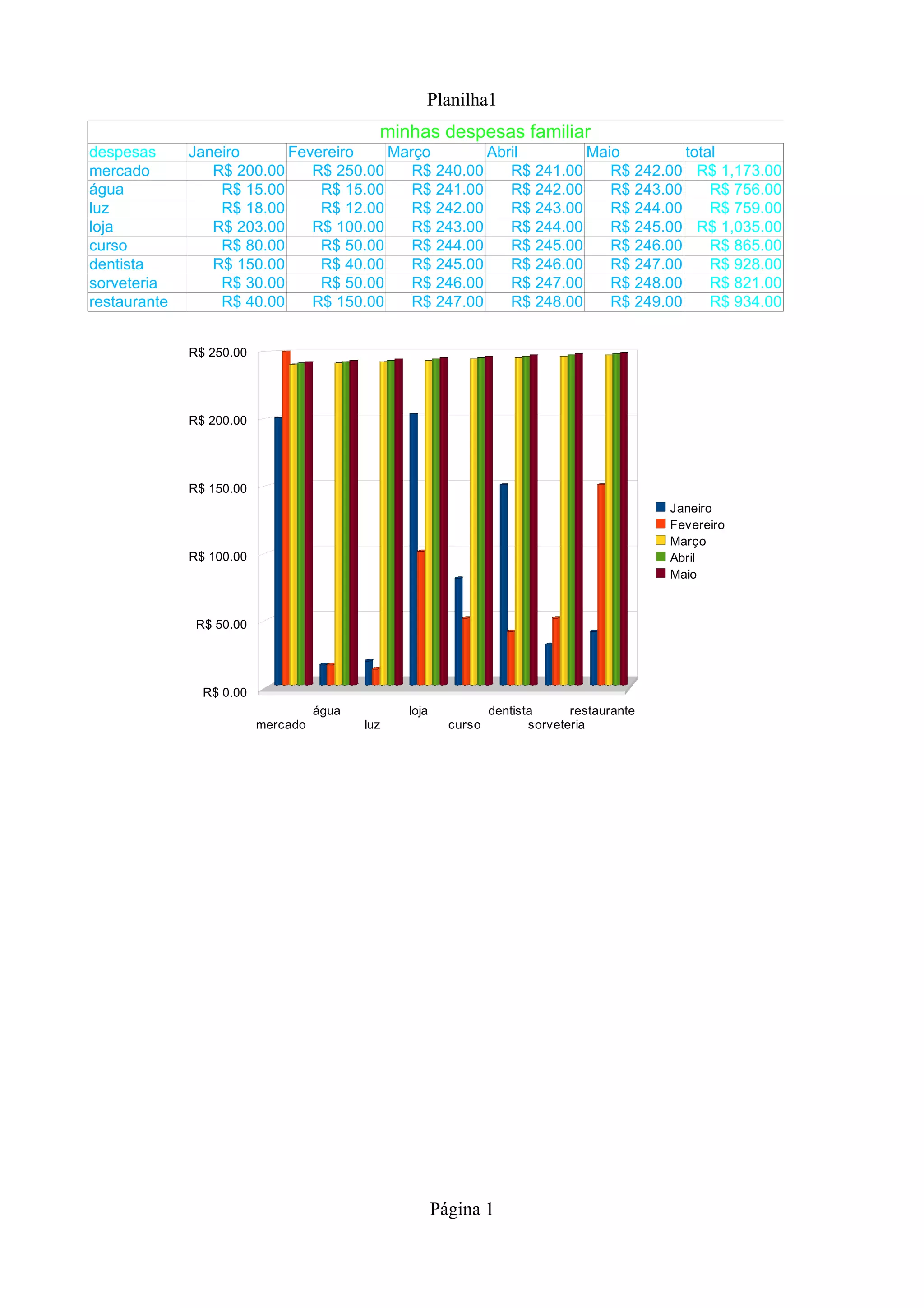 Este documento é uma planilha que lista as despesas familiares de janeiro a maio, incluindo categorias como mercado, água, luz, loja, curso, dentista, sorveteria e restaurante, com os totais para cada mês e no total. Há também um gráfico de barras comparando os gastos por categoria e uma tabela com as médias mensais.