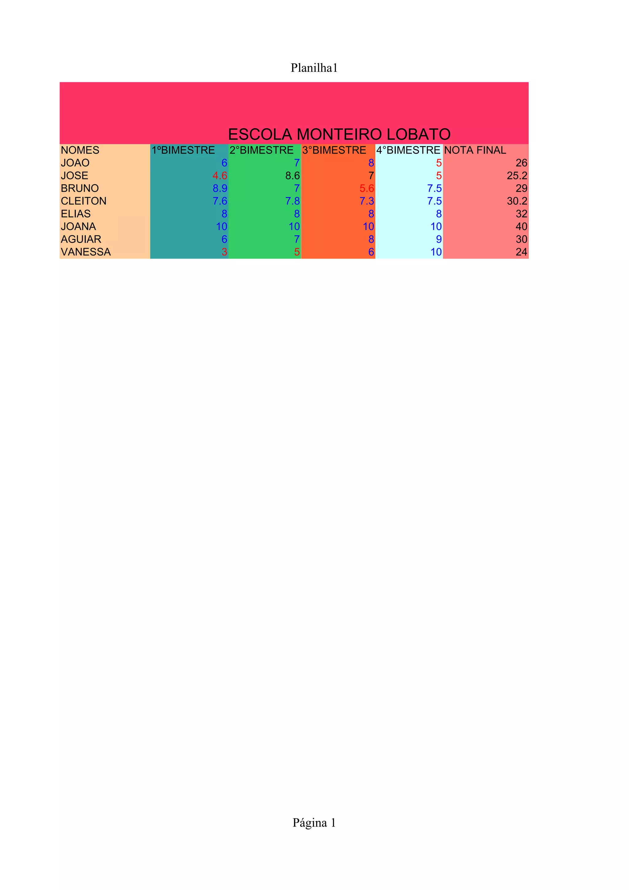 O documento apresenta as notas de 7 alunos em 4 bimestres e a média final de cada um. A aluna Joana teve as maiores notas, com média final de 16, enquanto Vanessa reprovou com média de 9,6.