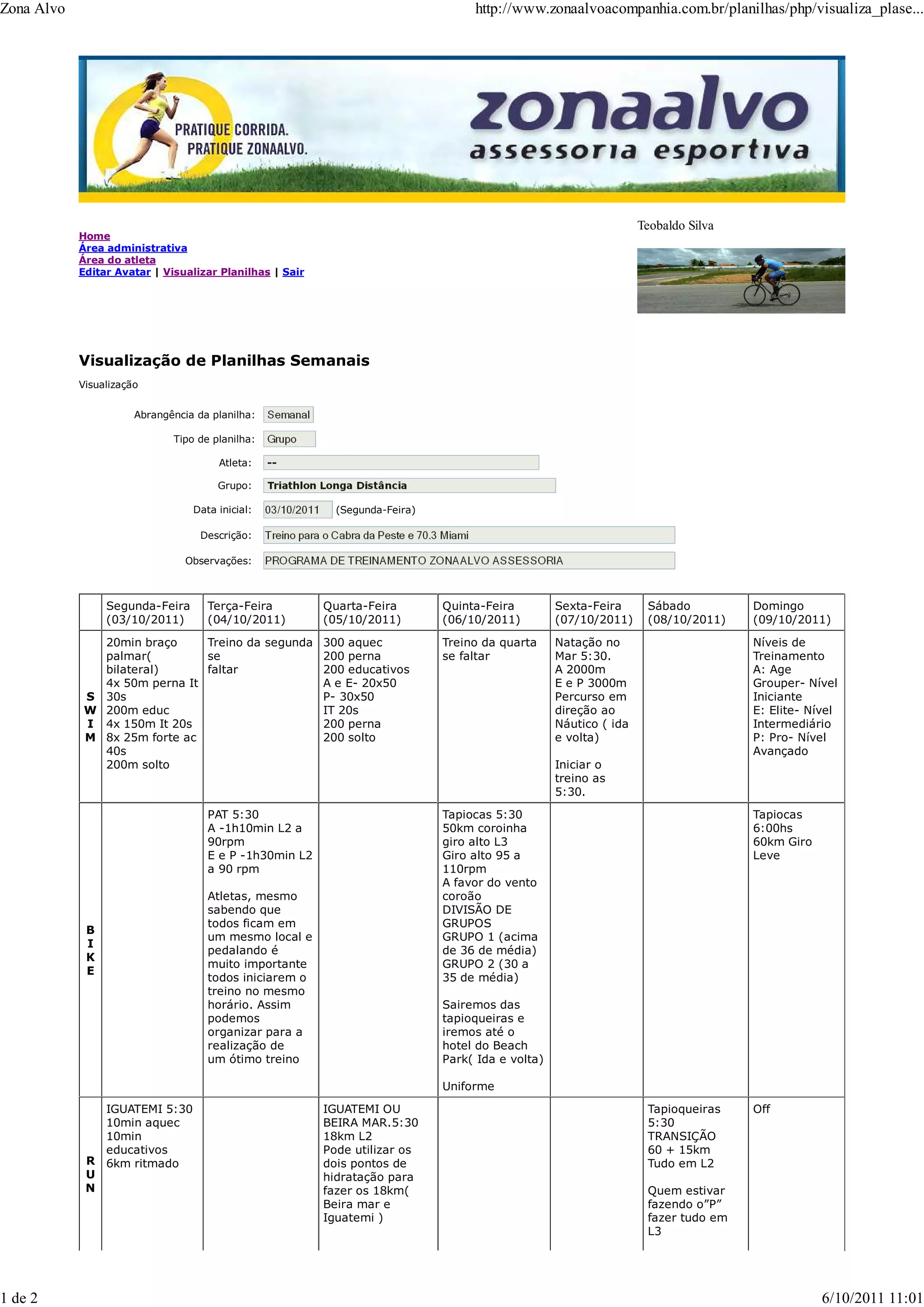 O documento apresenta a planilha semanal de treinos de um atleta chamado Teobaldo Silva. A planilha descreve os exercícios e atividades de treinamento para cada dia da semana, incluindo detalhes como distância, tempo e nível de intensidade.