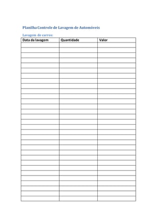 Esta planilha controla as lavagens de automóveis realizadas, registrando a data, quantidade de lavagens e o valor total arrecadado em cada dia.