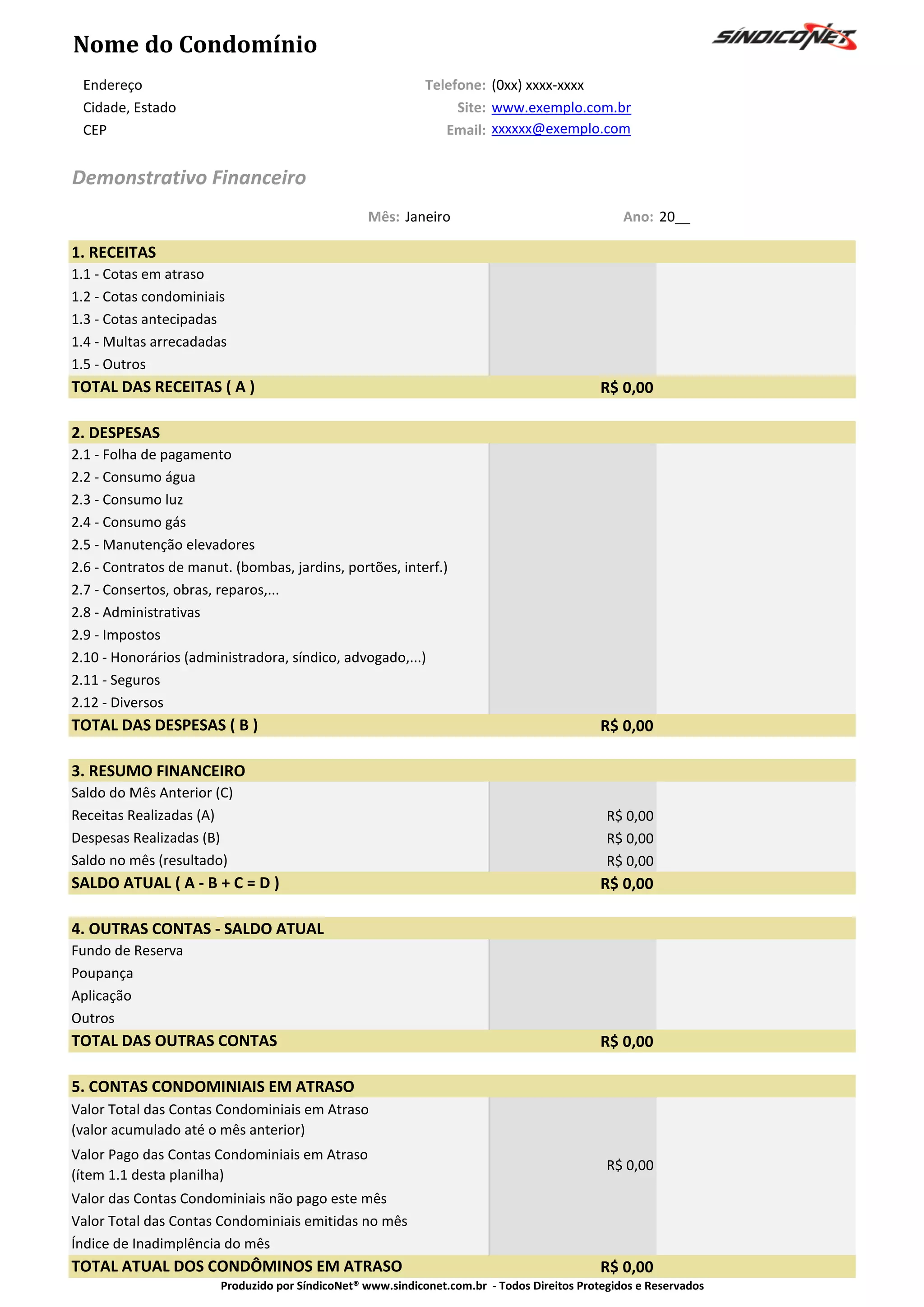 O demonstrativo financeiro de janeiro mostra que não houve receitas ou despesas no mês. O saldo atual das contas condominiais em atraso permaneceu o mesmo do mês anterior, enquanto o índice de inadimplência não pôde ser calculado por falta de contas emitidas ou pagas no período.