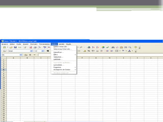 O documento discute planilhas eletrônicas, introduzindo a VisiCalc como a primeira e o Excel como a mais utilizada atualmente. Apresenta os conceitos básicos de células, colunas e linhas e como o Excel pode ser usado para criar tabelas, gráficos e acessar dados externos.