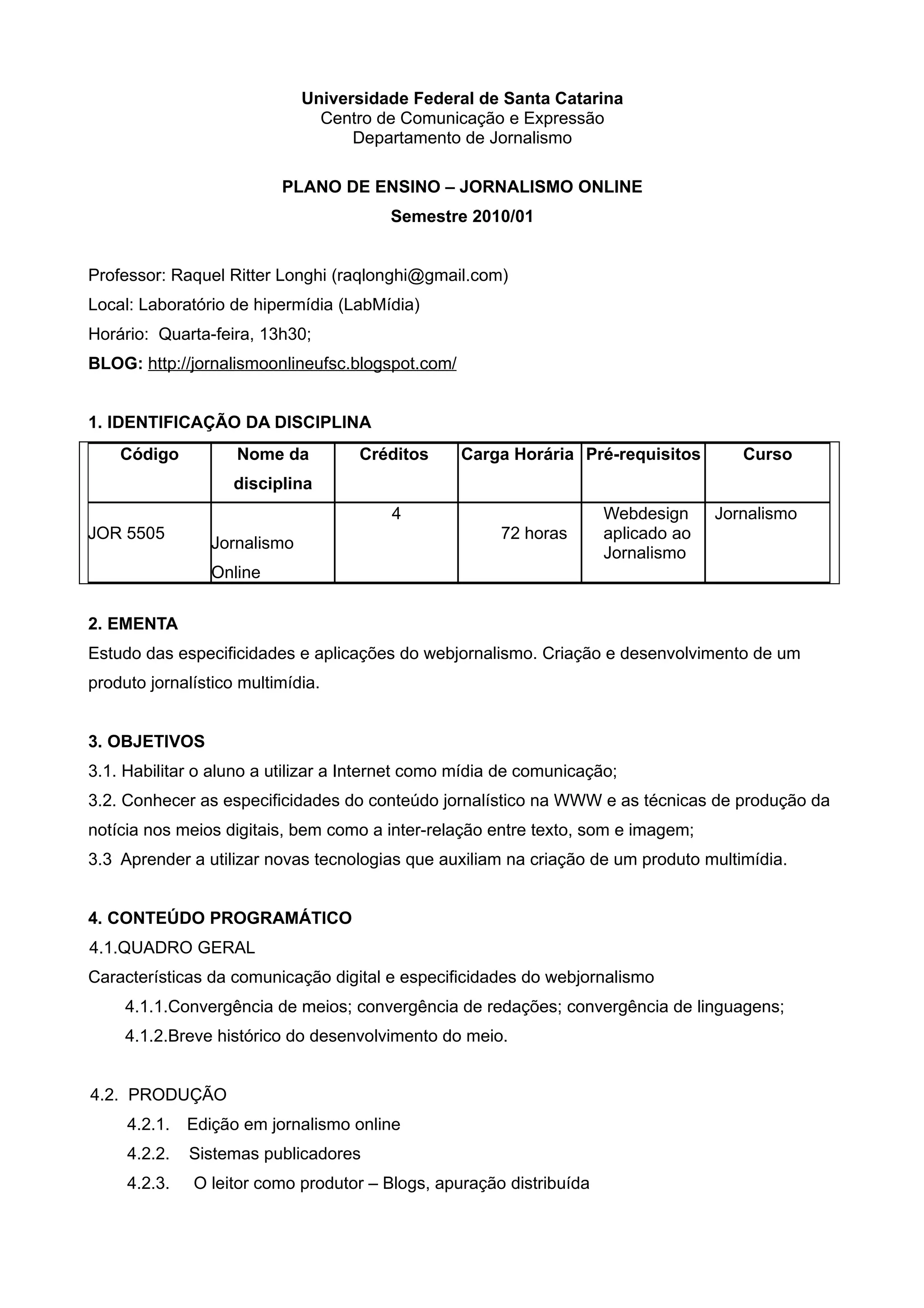 Este documento apresenta o plano de ensino para a disciplina de Jornalismo Online no semestre 2010/01. A disciplina será ministrada pelo professor Raquel Ritter Longhi e terá como objetivo ensinar os alunos sobre as especificidades do jornalismo na internet e a produção de conteúdo multimídia. O curso abordará tópicos como edição online, sistemas de publicação, jornalismo participativo e narrativas multimídia através de aulas expositivas, seminários e um projeto prático de desenvolvimento de um prod
