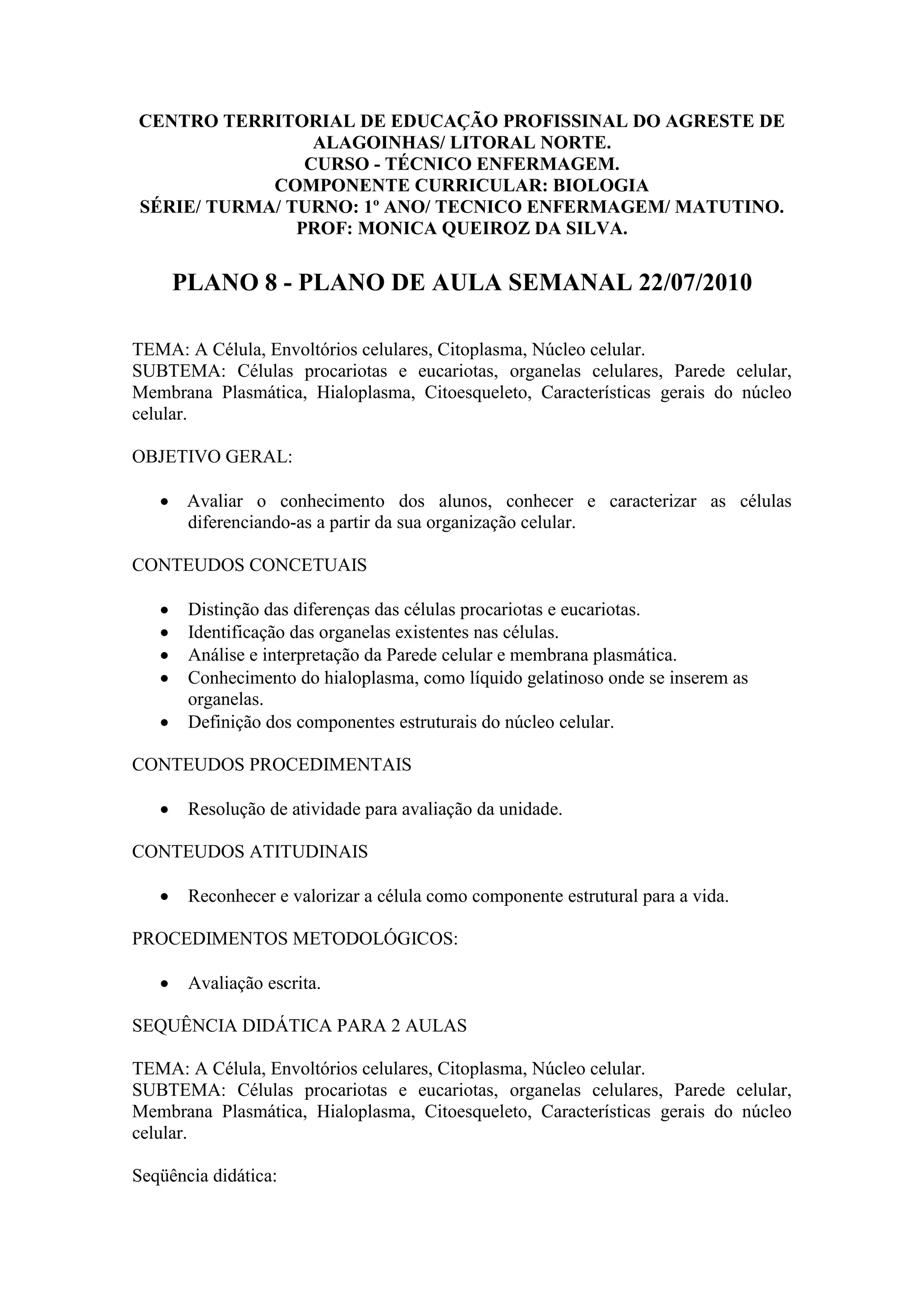 Este documento apresenta o plano de aula semanal para uma turma de Técnico em Enfermagem sobre o tema célula. O objetivo geral é avaliar o conhecimento dos alunos sobre células procariotas e eucariotas, organelas celulares, membrana plasmática e características do núcleo celular. A sequência didática inclui distribuir uma prova, recolher cartazes e avaliar o aprendizado dos alunos.