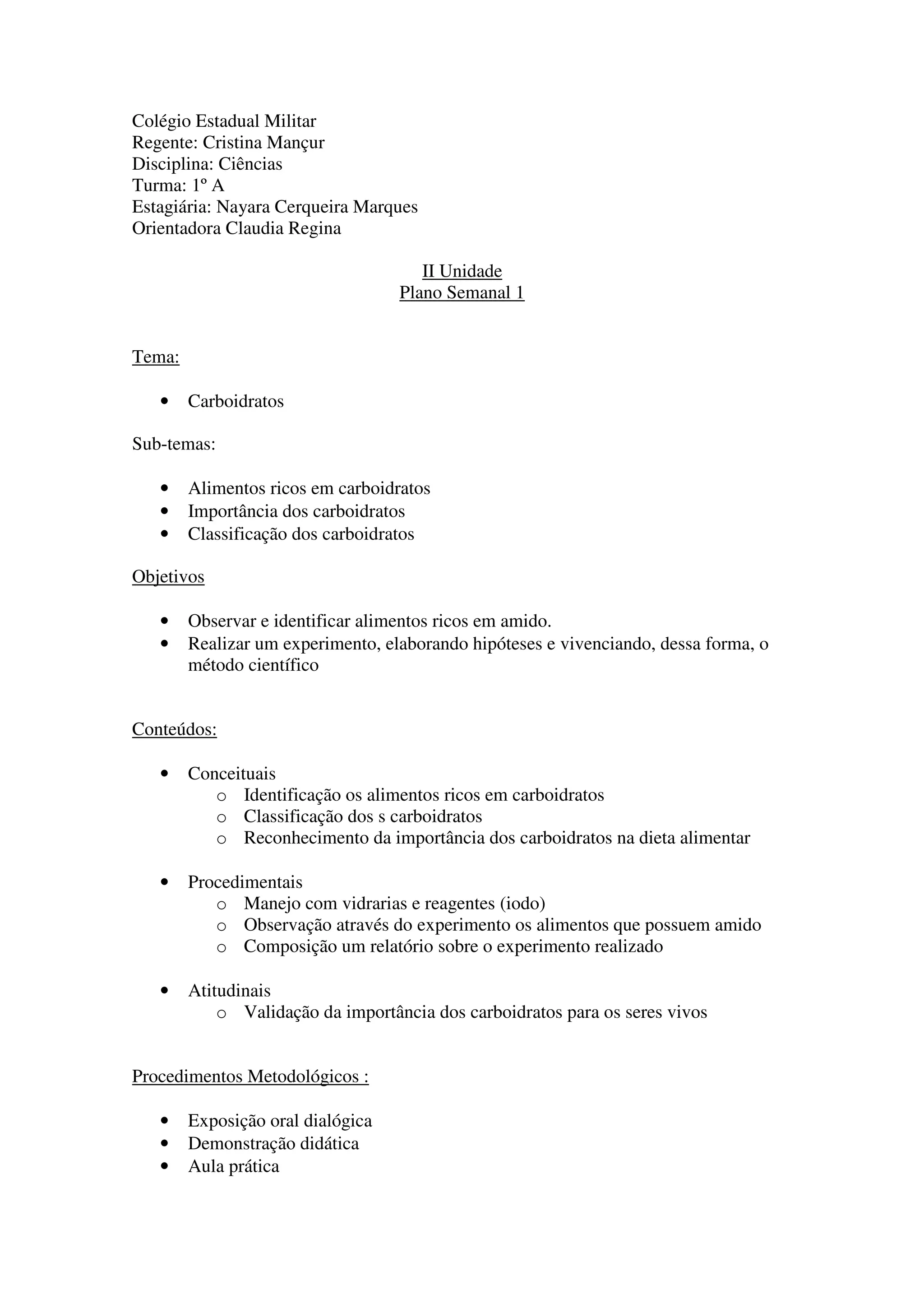 O documento descreve um plano de aula sobre carboidratos para o 1o ano do ensino médio. O plano inclui os seguintes tópicos: tema (carboidratos), subtemas (alimentos ricos em carboidratos, importância, classificação), objetivos, conteúdos, procedimentos metodológicos e avaliação. A seqüência didática inclui aulas expositivas, demonstrações e uma aula prática de experimento sobre a presença de amido em alimentos.