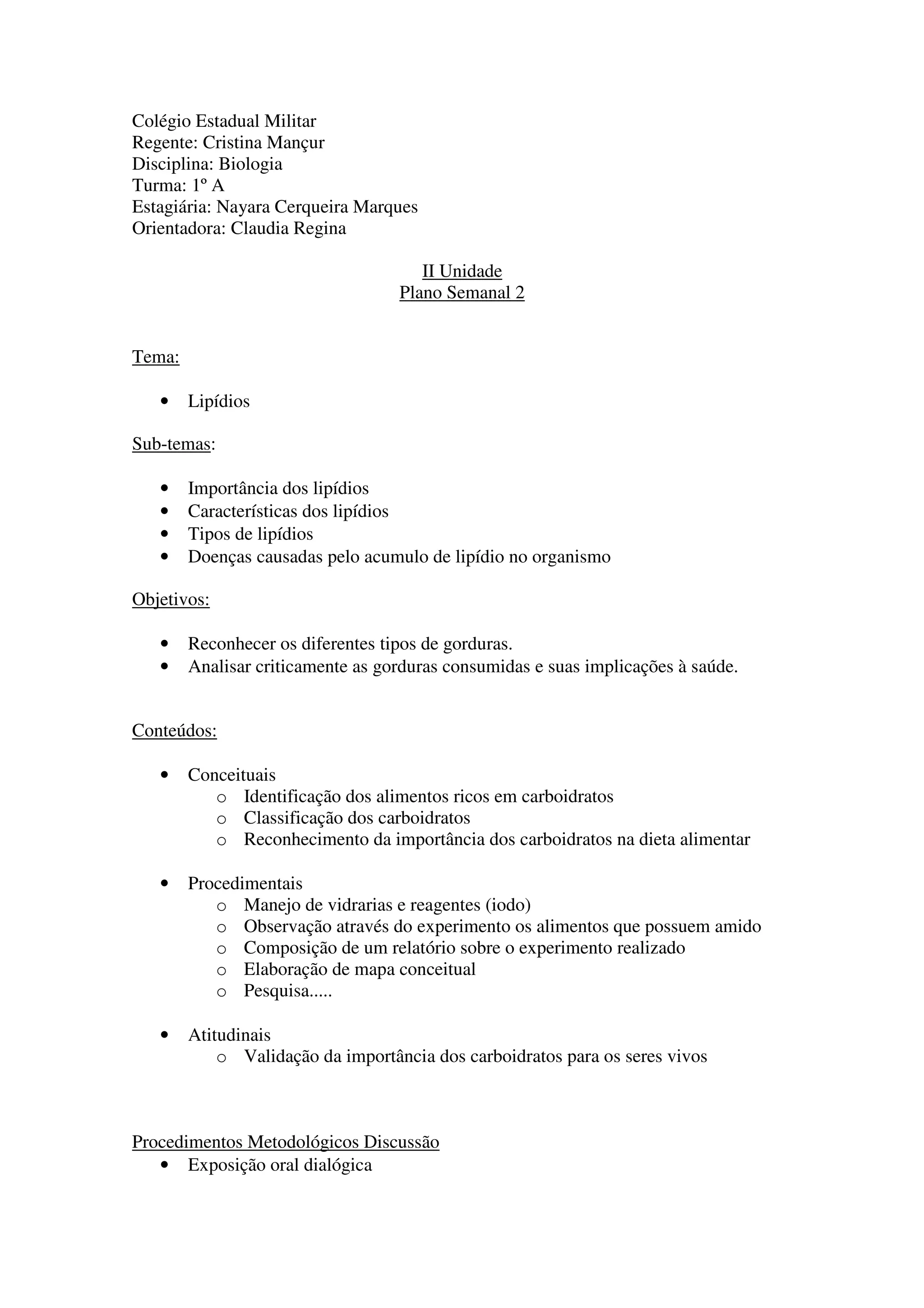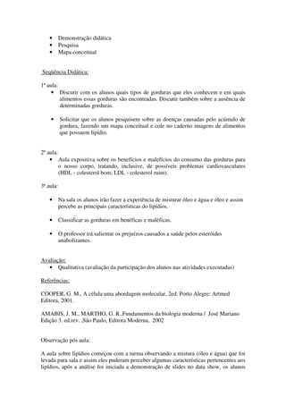 O documento discute um plano semanal de biologia sobre lipídios. O plano inclui os seguintes tópicos: a importância, características e tipos de lipídios, assim como doenças causadas por seu acúmulo. As atividades propostas incluem discussões sobre gorduras nos alimentos, pesquisas sobre doenças, demonstrações sobre características de lipídios e os efeitos dos esteróides anabolizantes.