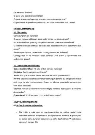 Este plano de aula tem como objetivo ensinar conceitos básicos de matemática como história dos números, sequência numérica, antecessor e sucessor por meio de jogos e atividades lúdicas. O conteúdo será apresentado inicialmente e depois reforçado em jogos que trabalham contagem, adição, subtração e comparação numérica. A avaliação será feita por meio da observação da participação dos alunos nos jogos e da compreensão dos conceitos matemáticos.
