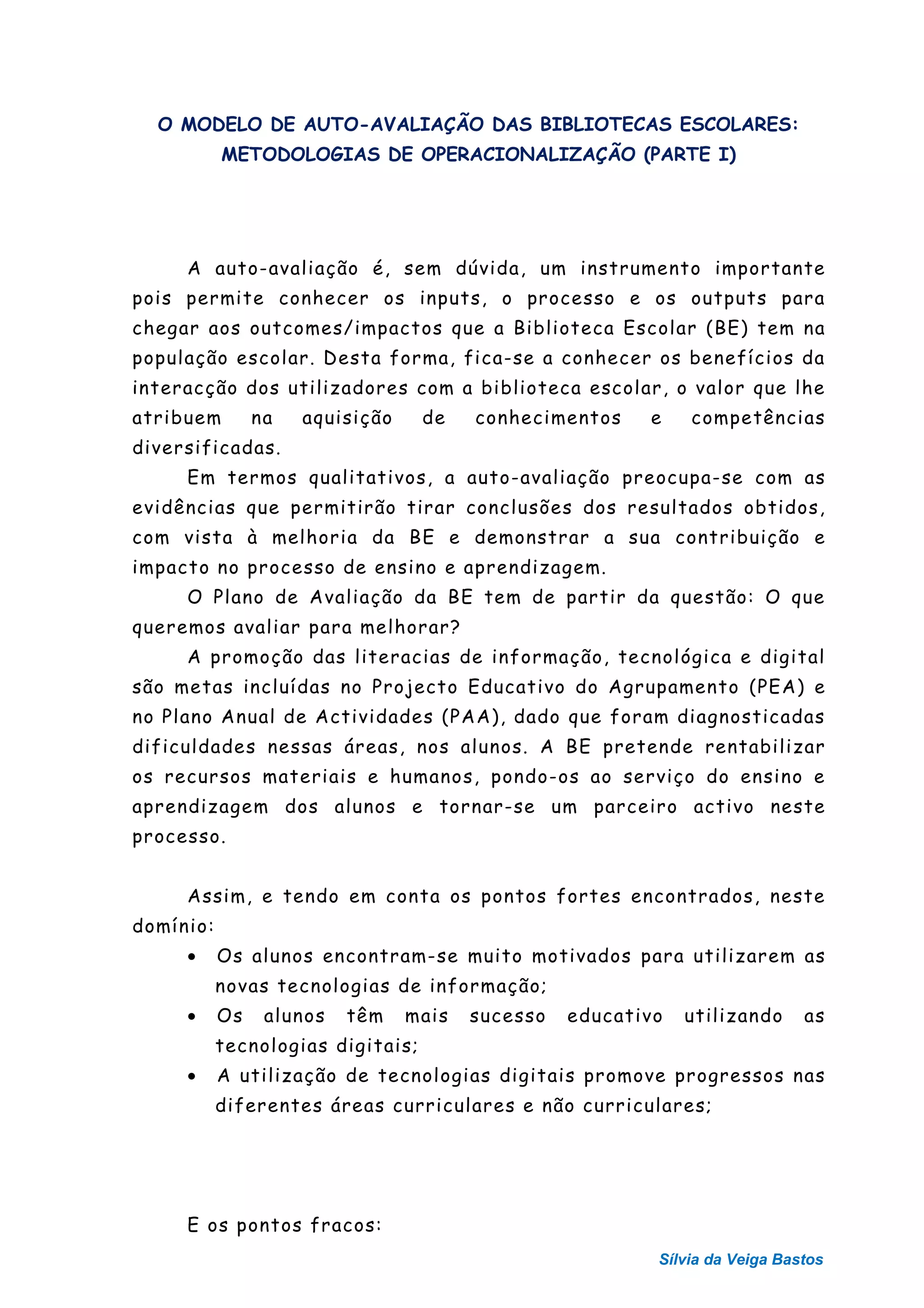 O documento discute a autoavaliação da biblioteca escolar com foco em promover literacias de informação, tecnológica e digital. Ele propõe avaliar como a biblioteca apoia o desenvolvimento curricular, especialmente no que diz respeito a essas literacias, identificando problemas como equipamentos insuficientes e falta de formação dos professores em TIC. A avaliação visa melhorar o apoio da biblioteca à aprendizagem e ao sucesso escolar.