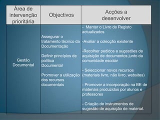 O documento discute a importância de se realizar uma auto-avaliação de bibliotecas escolares para melhorar suas práticas e resultados. Ele descreve a necessidade de diagnosticar a situação atual da biblioteca, notando a falta de registros, coordenação e políticas de gestão eficientes. Finalmente, propõe a elaboração de um plano de ação para redefinir as diretrizes da biblioteca.