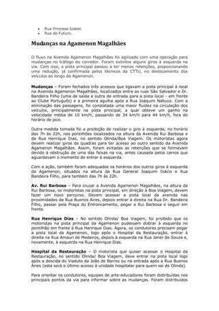 O documento descreve várias ações do plano de trânsito da prefeitura do Recife, incluindo: 1) aumento do efetivo de agentes de trânsito, 2) modernização de semáforos, 3) mudanças nas vias Avenida Agamenon Magalhães, Avenida Norte e Rua Capitão Rebelinho para melhorar o fluxo, e 4) novas regras para carga e descarga.