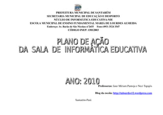 O documento apresenta o plano de ação para o ano letivo de 2010 do Laboratório de Informática da Escola Municipal de Ensino Fundamental Maria de Lourdes Almeida. O plano descreve as metas, ações, estratégias e cronograma para oferecer cursos de formação continuada a professores, incentivar a elaboração de projetos pedagógicos e garantir o acesso dos alunos aos recursos digitais.