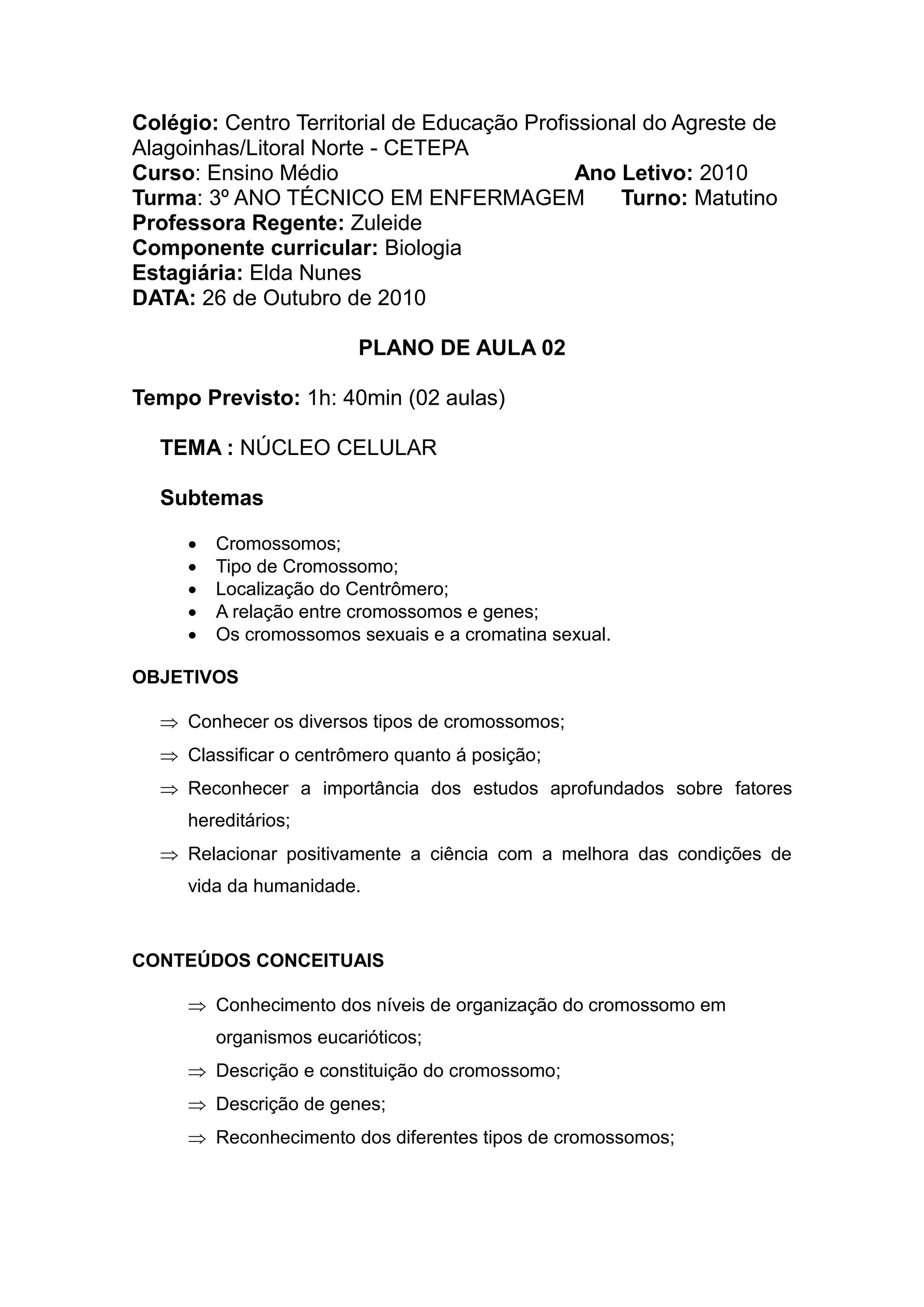 Este plano de aula aborda o tema do núcleo celular, com foco nos cromossomos. Os objetivos são conhecer os diferentes tipos de cromossomos, sua relação com os genes e doenças hereditárias. As atividades incluem uma aula expositiva com demonstrações e uma atividade prática de montar um cariótipo.